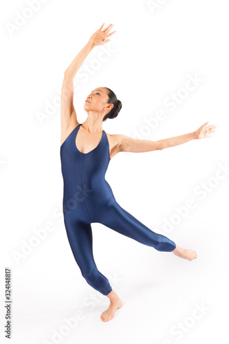 © duke2015, Obraz premium Adult woman dancer in blue bodysuit dancing in the studio.