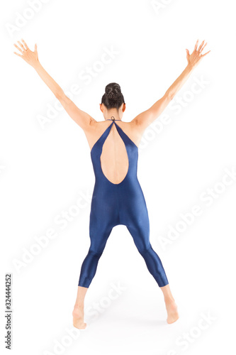© duke2015, Obraz premium Adult woman dancer in blue bodysuit dancing in the studio.
