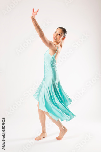 © duke2015, Naklejka premium Adult woman dancing in the studio in a blue dress.