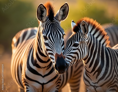 © Pete, Fototapeta premium Adult zebra, baby foal stand close in African savanna nature. Black, white stripes shine with golden light. Wild animals show strong bond at sunset. Family love in wilderness. Parent, baby together.