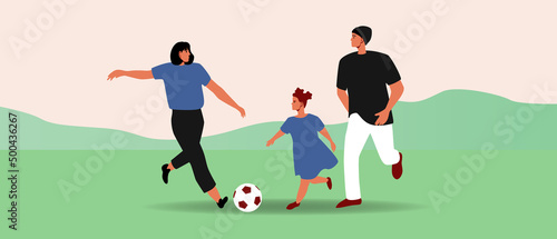 © Vikkymir Store, Fototapeta premium Adults play football with child, flat vector stock illustration with sports family, parents and girl