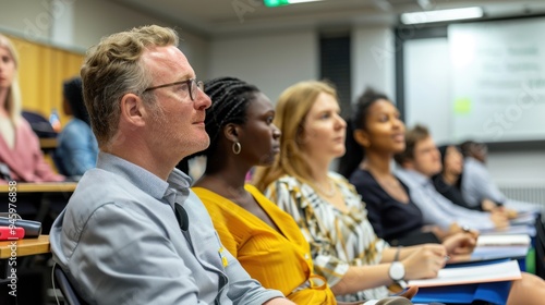 Fototapeta premium Adults sitting in a modern classroom, attentively listening to a lecturer...