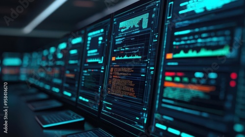 © Vector_Collections, Obraz premium Advance Security Data Management Planning, A futuristic workspace filled with multiple screens displaying vibrant data analytics and digital interfaces.