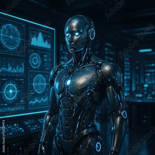 Naklejka premium Advanced agentic AI standing in a high-tech control room filled with data displays and interactive screens
