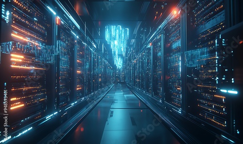 Obraz premium Advanced AI-Controlled Server Room with Glowing Servers and Holographic Interfaces, Technological Sophistication, Photo Realistic