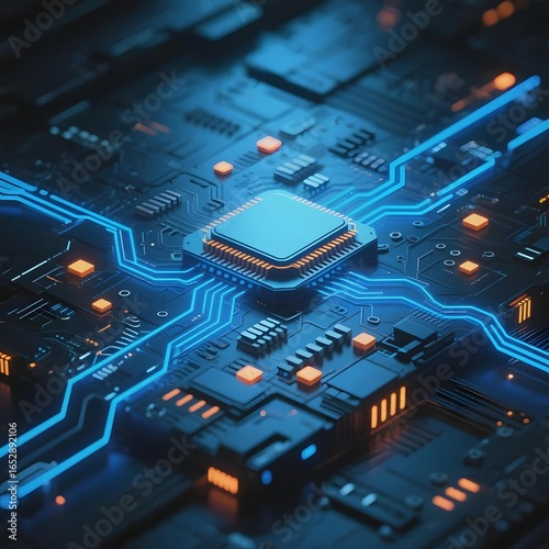 © jiale, Obraz premium Advanced Circuit Board with Illuminated Pathways and Microprocessors