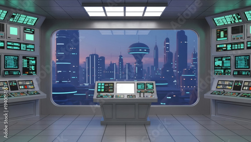 Obraz premium Advanced Command Center with Panoramic View of a Sci-Fi Cityscape at Dusk,...