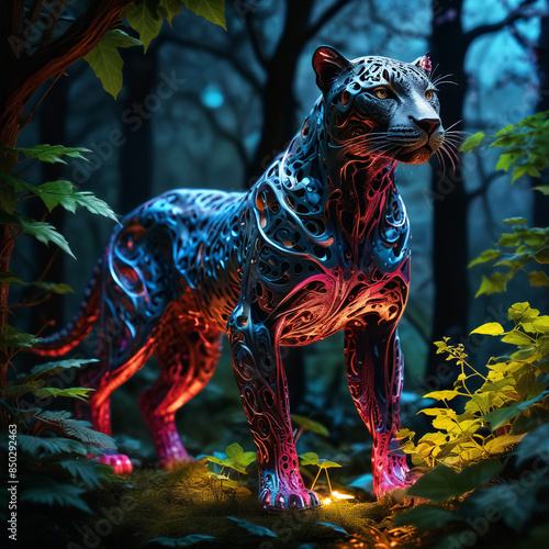 Naklejka premium Advanced Cybernetic Jaguar in Glowing Jungle: High-Resolution Digital Art of a Futuristic Robotic Animal with Bioluminescent Features and Surreal Forest Scene for Sci-Fi Themes
