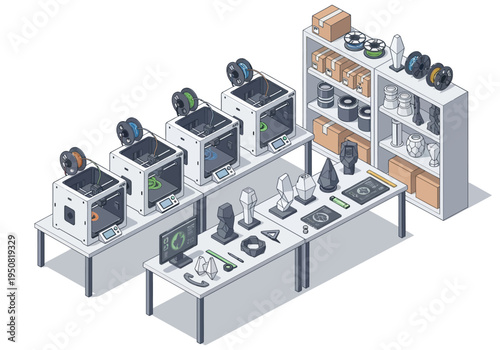 © Jakmania, Obraz premium Advanced 3D printing technology setup with multiple machines, filament spools, and printed objects on display