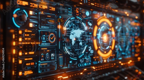 © Oksana, Obraz premium Advanced global data dashboard with monitors.