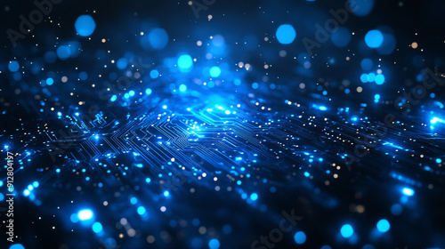 © TyliJura, Fototapeta premium Advanced Glowing Blue Circuit Board with Intricate Electronic Patterns and Light Points for Modern Technology and Engineering Concepts