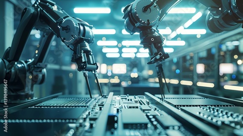 © Jbgoals, Fototapeta premium Advanced High Precision Robot Arm inside Bright Electronics Factory. Electronic Devices Production Industry, Generative AI illustrations.