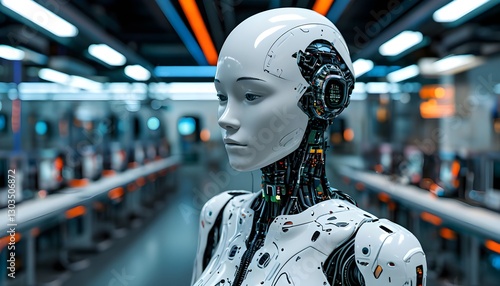 © Deepak, Fototapeta premium Advanced Humanoid Robot with Exposed Cybernetic Components in Futuristic Laboratory