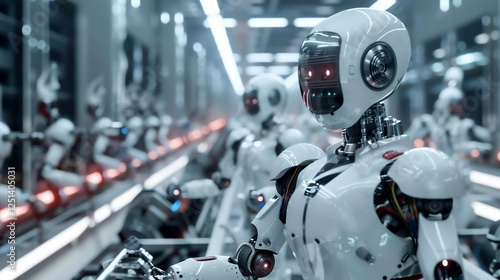 Fototapeta premium Advanced industrial robots working in modern factory setting, showcasing automation and technology. scene highlights precision and efficiency in manufacturing