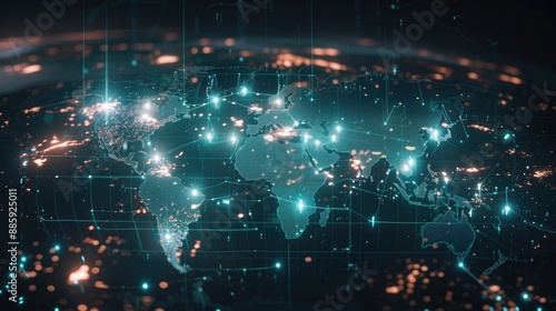 Naklejka premium Advanced logistics interface over a world map, city nodes glowing with...