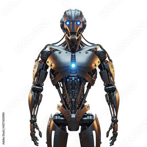 Fototapeta premium Advanced mechanical robot cyborg with glowing blue eyes and intricate details standing prominently transparent background