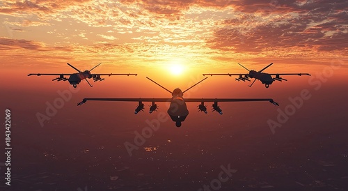 © MiltonKumar, Obraz premium Advanced military drones flying patrol at sunset image