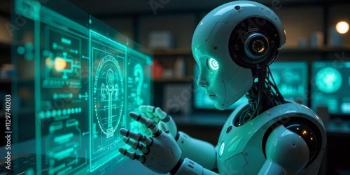 Fototapeta premium Advanced robot analyzing data in a futuristic laboratory environment showcasing high-tech interfaces and glowing graphics