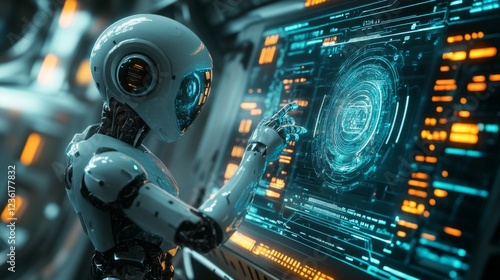 Fototapeta premium Advanced Robot Interacting with Futuristic Interface