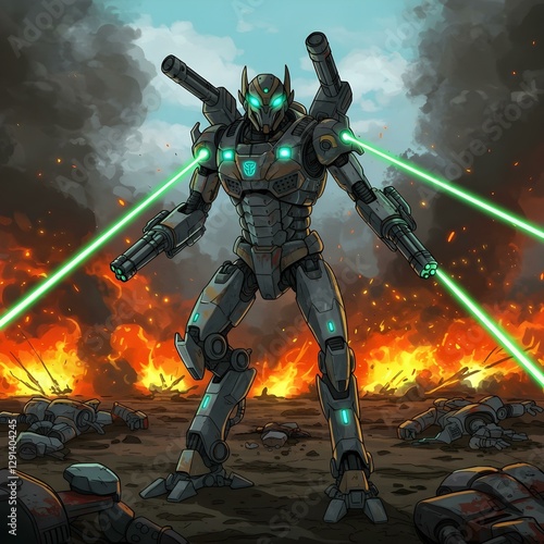 © Thnh, Fototapeta premium Advanced Robot Warrior Fighting in a Fiery Battlefiel