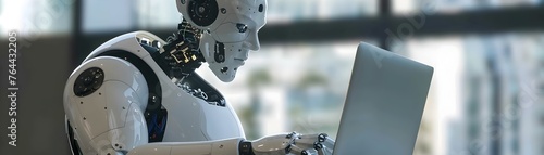 © yelosole, Fototapeta premium Advanced Robotic Arm Interacting with Laptop Computer in Creative Workspace