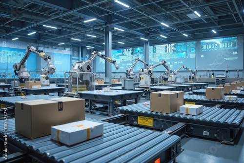Naklejka premium Advanced Robotics in Package Sorting Facility with Automated Systems, Conveyor Belts, and Streamlined Operations for Efficient Logistics Management and Distribution Processes