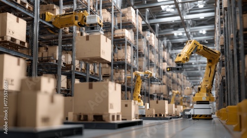 © Ilmi, Naklejka premium Advanced Robots Organizing and Stacking Boxes in a Modern Warehouse Environment for Efficient Inventory Management