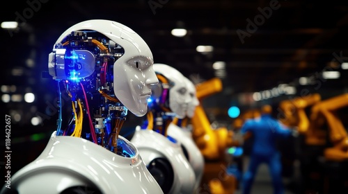 Naklejka premium Advanced robots with glowing circuits work in an industrial setting,...