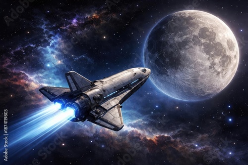 Obraz premium Advanced space shuttle navigating through space to the moon