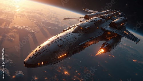 © miss irine, Fototapeta premium Advanced spaceship flies near planet Earth during sunset. Vehicle has bright orange engines on. Spacecraft flies in orbit above clouds. Future travel by ship.