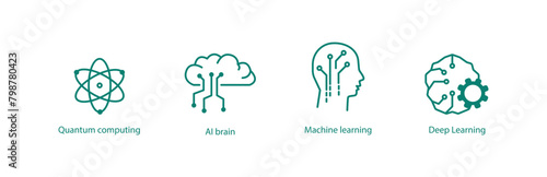 Obraz premium Advanced Tech Vector Icons: Quantum Computing, AI Brain, Machine Learning, Deep Learning