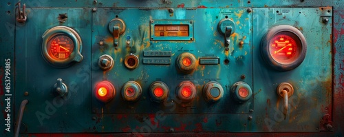 © ZeNDaY, Fototapeta premium Advanced Technology Close-Up of Cement Mixer Control Panel in Operation with Illuminated Buttons and Dials