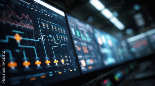 © Mary, Obraz premium Advanced technology control panel displays with data graphs