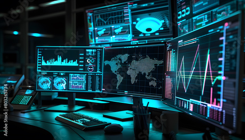 Fototapeta premium Advanced Trading Desk with Multiple Computer Monitors Displaying Financial Data