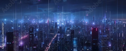 © pisan thailand, Fototapeta premium Advanced Urban Management City Skyline at Night with Glowing Data Streams Connecting Buildings