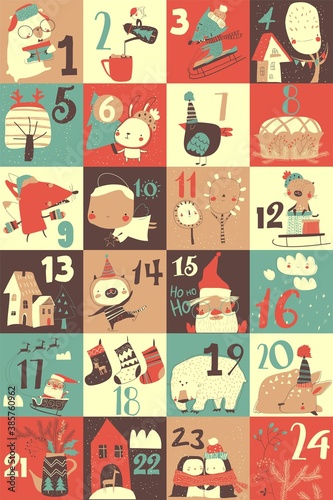 Fototapeta premium Advent calendar with christmas decoration and characters