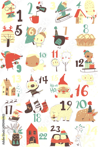 Fototapeta premium Advent calendar with christmas decoration and characters. Vector illustartion