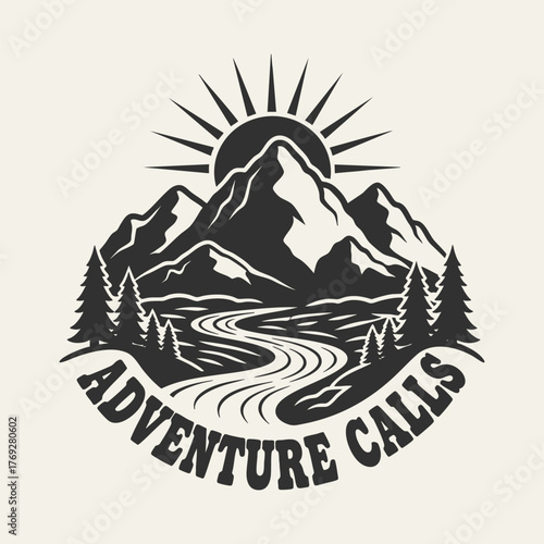 © FZ, Naklejka premium Adventure Calls Mountain River Trees Sun Emblem.
