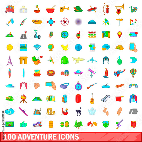 Fototapeta premium 100 adventure icons set, cartoon style