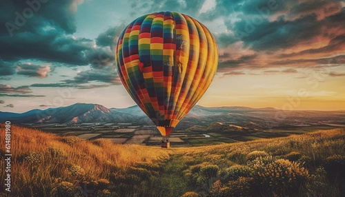 © Stockgiu, Fototapeta premium Adventure in the sky: Hot air balloon soars over mountain range generated by AI