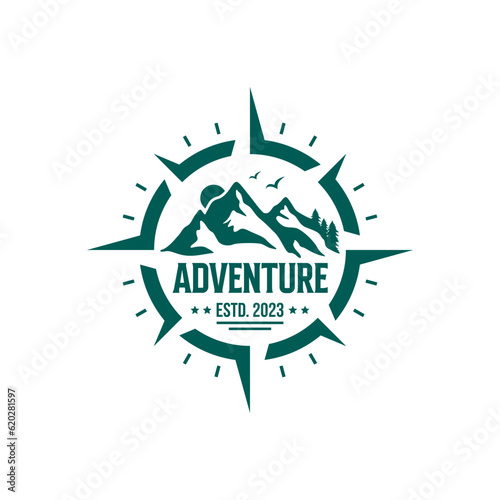 © Jukyelabs, Fototapeta premium Adventure Logo with Mountain and Compass Design Vector Illustration Template
