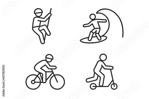 © Andy, Naklejka premium Adventure sports vector line icon set. Climbing, surfing, biking, scootering outline symbols. Extreme outdoor activities, recreation and lifestyle pictogram collection.