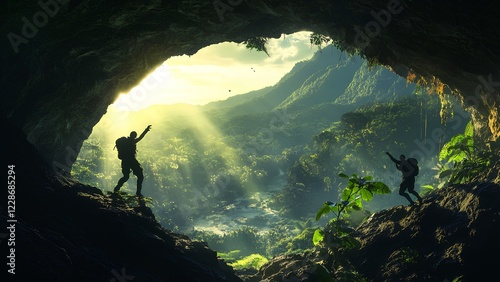© YAK XL, Obraz premium Adventurers Exploring a Sunlit Jungle Cave