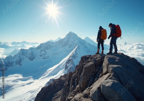 © puruan, Fototapeta premium Adventurers on mountain peak admire stunning snow-covered landscape at sunrise