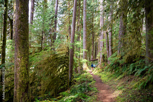 Fototapeta premium Adventurous athletic male hikers, hiking along a forest trail in the Pacific Northwest.