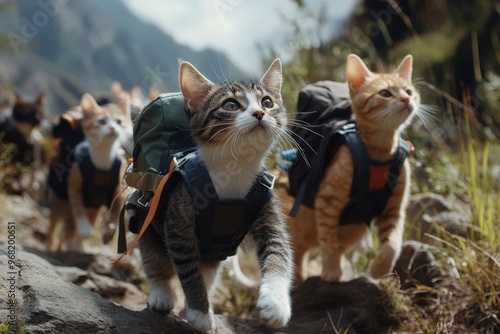© S u n n y B u n n y, Obraz premium Adventurous cats trekking through mountain terrain with backpacks.