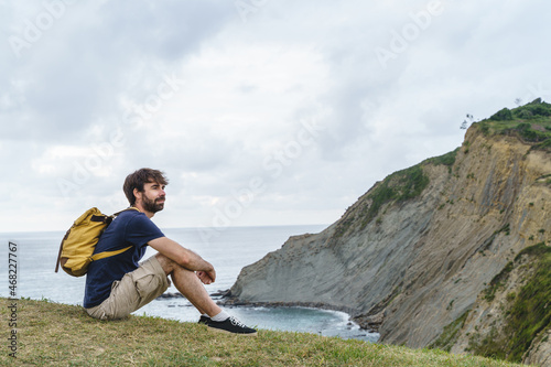Obraz premium Adventurous caucasian man isolated sit on a bench with selective focus on the cliff. Horizontal panoramic view of man with backpack traveling in the coast. People and travel concept.