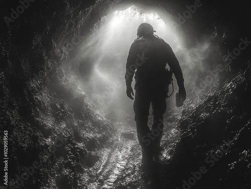 Fototapeta premium Adventurous caver exploring dark cave with misty light