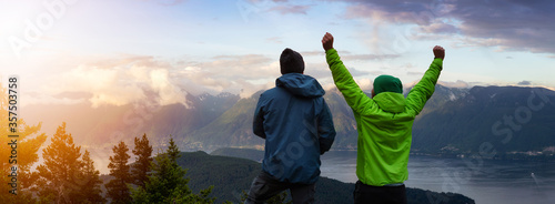 Fototapeta premium Adventurous Friends on top of a Mountain Top with Hands up. Sunset or Sunrise Composite. Background from Bowen Island, British Columbia, Canada.