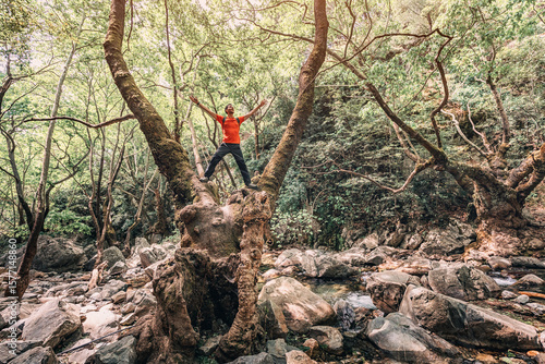 Naklejka premium Adventurous hiker standing on a large tree surrounded by lush forest, enjoying nature and the tranquility of a rocky stream below